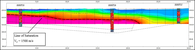 Seismic Refraction Tomography (SRT) is a good way to define the saturation level of soils, 1500m/s Vp indicated >99% saturation. This provides are very useful “delineation” of where tailings materials may liquefy. This interface between dry and saturated tailings allows determination of groundwater level geometries.