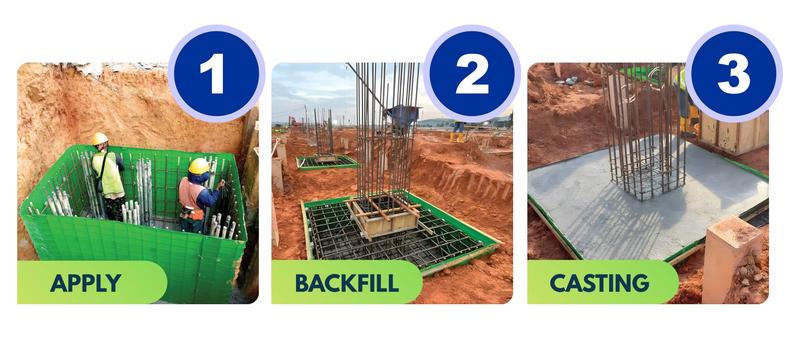 The concept behind PECAFORM is straightforward: let the soil do the work. Traditional formwork relies on timber or steel supports, adding cost, time and labor to every pour. PECAFORM replaces those with a lightweight polymer sheet that holds the concrete in place using compacted soil for support.