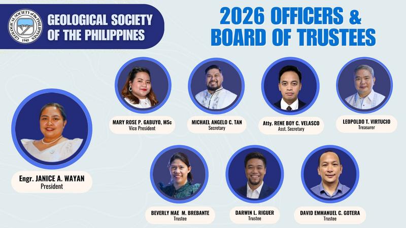 The Geological Society of the Philippines (GSP) recently inducted its new Board of Trustees and Officers for 2026, led by President Engr. Janice Wayan and Vice President Ms. Mary Rose Gabuyo. Other officers are: Michael Angelo C. Tan, Secretary; Atty. Rene Boy C. Velasco, Asst. Secretary; Leopoldo T. Virtucio, Treasurer; and Trustees Beverly Mae M. Brebante, Darwin Riguer, and David Gotera.