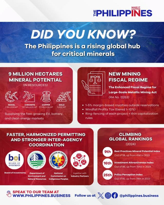 The Philippines is positioned to play a major role in the global clean energy transition due to its large deposits of nickel, copper, cobalt, and other strategic minerals. These materials are essential for manufacturing electric vehicle batteries, wind turbines, solar technologies, and energy storage systems.