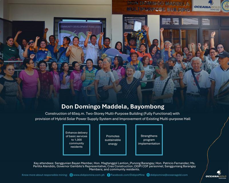OceanaGold Philippines Inc. has turned over a two-storey multi-purpose building to Barangay Don Domingo Maddela in Bayombong, Nueva Vizcaya, providing a new community facility powered by renewable energy.