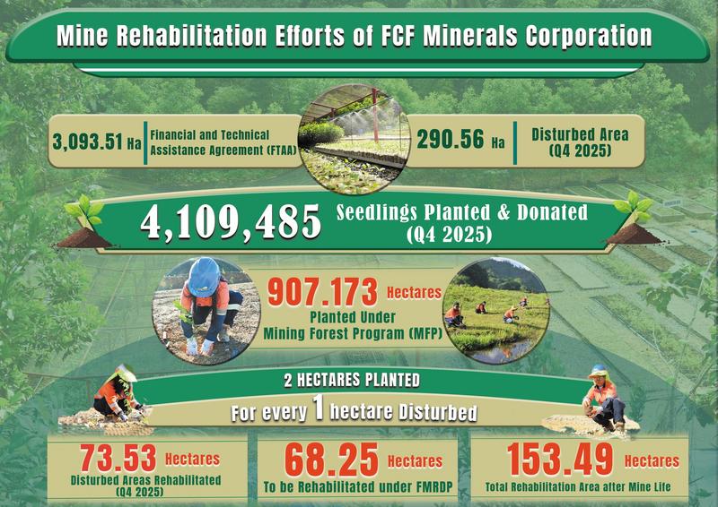 As of the fourth quarter of 2025, the company reported that it had managed and monitored 290.56 hectares of disturbed land within its 3,093.51-hectare Financial and Technical Assistance Agreement (FTAA) area, while progressively restoring affected sites through structured environmental programs.